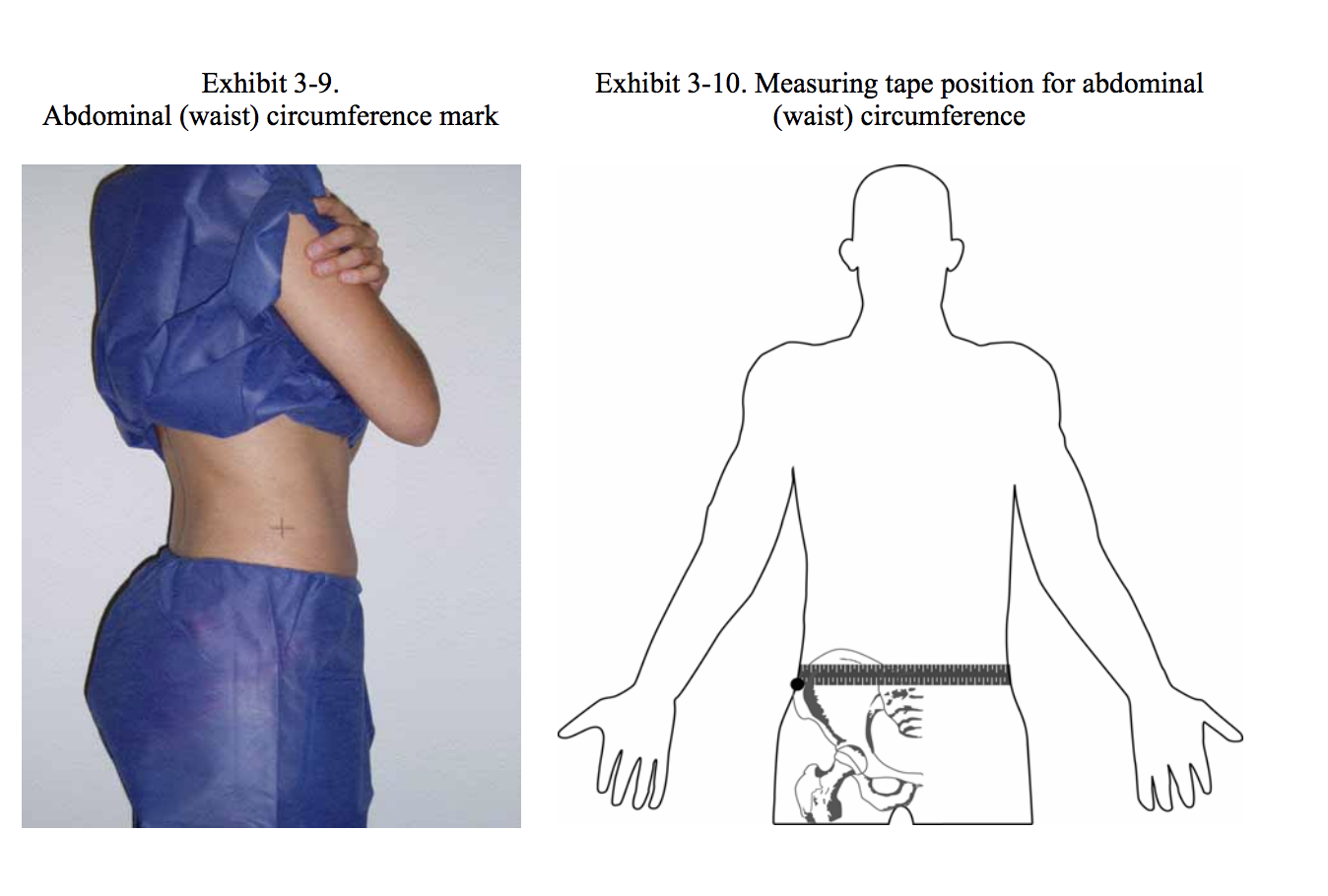 On the plus side, we have some guidance from the Centers for Disease Control and Prevention (CDC) who commission yearly data collection series, The National Heallth and Nutrition Examination Survey (NHANES). Given that many of the waist circumference studies rely on NHANES data, it is reasonable to use their procedure for our own purposes as well.