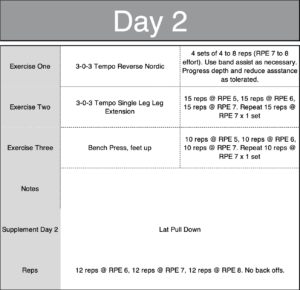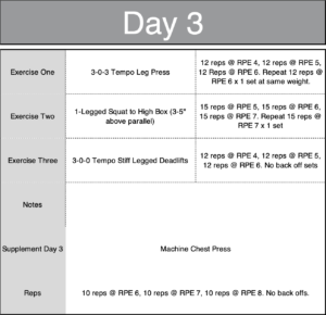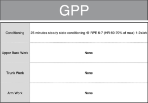 This is a 12-week strength and conditioning program that includes three phases consisting of 3 resistance training workouts and 2 conditioning and conditioning-focused workouts per week. Here is a sample of the program from Week 1: