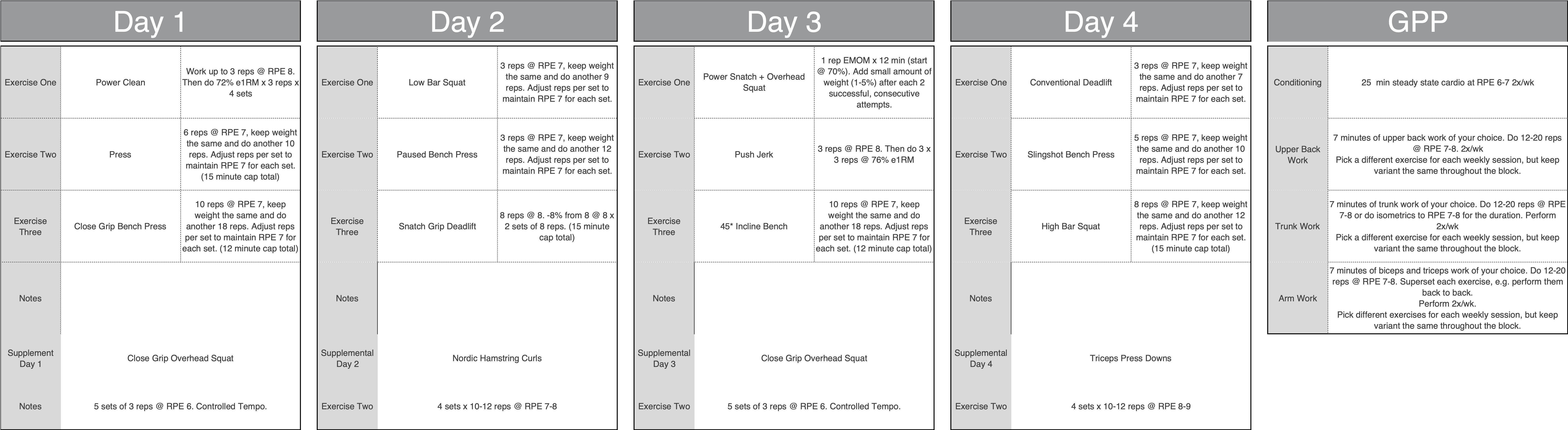 - A peaking phase for those wanting to test their 1-Rep Maxes for both powerlifting and Olympic weightlifting the end.