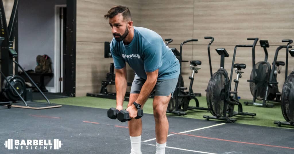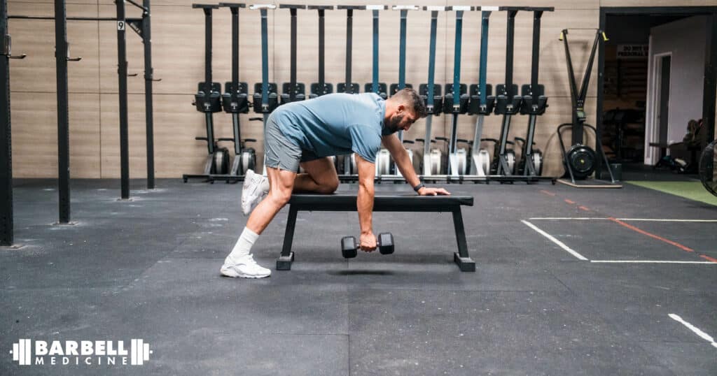 1-arm dumbbell rows primarily load now-familiar muscles of the back, such as the latissimus dorsi, teres major, trapezius, rhomboids, and posterior deltoid, while the biceps brachii and brachialis are synergists. This combination of primary mover and synergists is why we included 1-arm dumbbell rows in our recommendations for rear delt exercises.