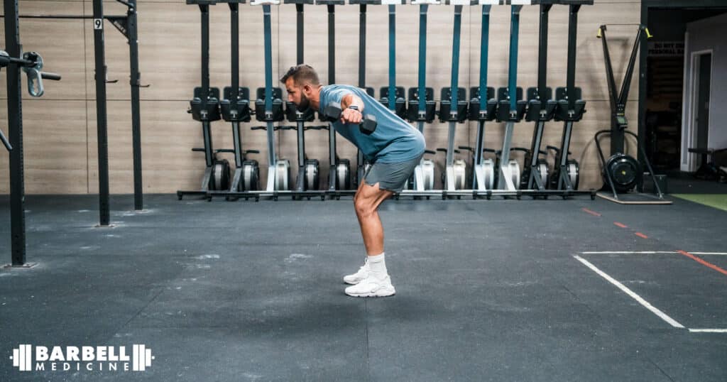 - Hinge over at the hip. Your torso should be relatively horizontal. Your arms should be hanging vertically with your elbows bent slightly.