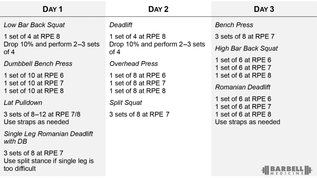 In addition to incorporating autoregulation, moving to a heavier top set followed by lighter back off sets for the compound lifts would allow strength to be built while lowering overall demands on the sensitive tendons. For example, working up to a top set of 3 repetitions at RPE 7, followed by sets of 4 to 6 reps at a 10–15% lighter load would accomplish this. The program can be supplemented with variations where the goal is not to set personal bests on every lift but to distribute the load and allow the athlete to adapt. As symptoms improve, and the athlete is tolerating movements better, the program could progress to the following: