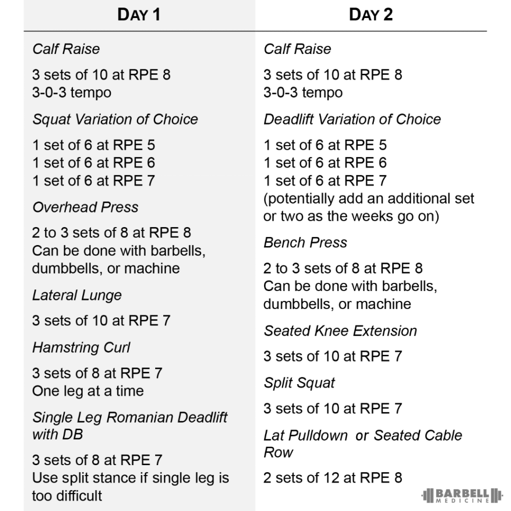 Because the focus was on powerlifting, almost all the lifter’s previous exercises were conventional versions of a squat, bench press, or deadlift. While specificity is necessary to address the currently painful areas, using different exercises and patterns helps build a broader base of athleticism and physical capacity. Variations in exercises that include single-leg versions, different types of bars, machines, dumbbells, and moving in different directions can distribute load through different parts of the body. Tendinopathy represents a maladaptive response of a particular tissue. Therefore, loading the same tissue in the same manner repeatedly is part of the problem and should be avoided. Additionally, we will use the ideas of working around and working through their current limitations. There are multiple ways of programming for this athlete, but one hypothetical template could look like this:
