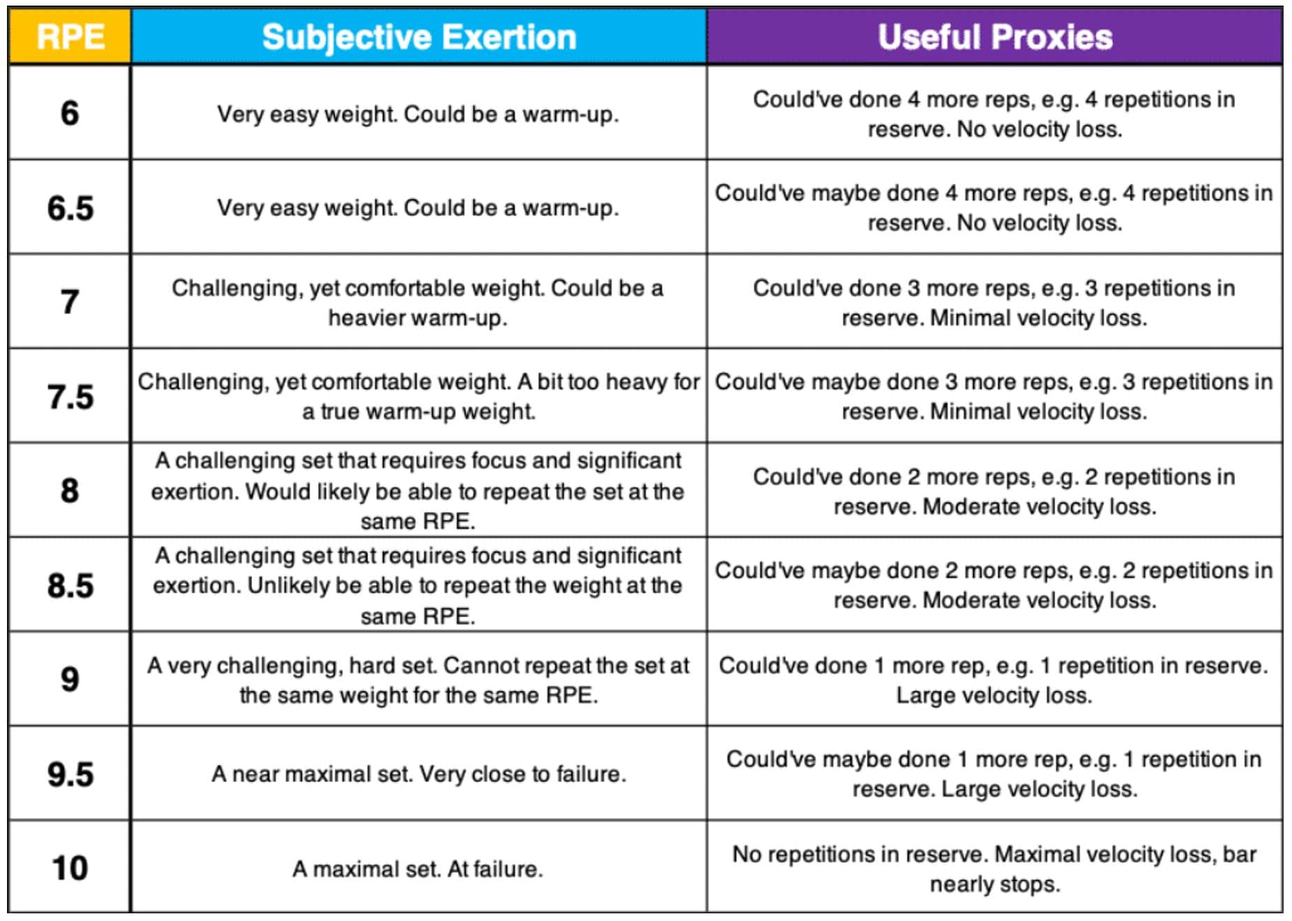 If you’re not familiar with RPE, consult the diagram on the right. Or just keep it at 10, which means that you couldn’t have done any more reps — i.e. this was your maximal effort.