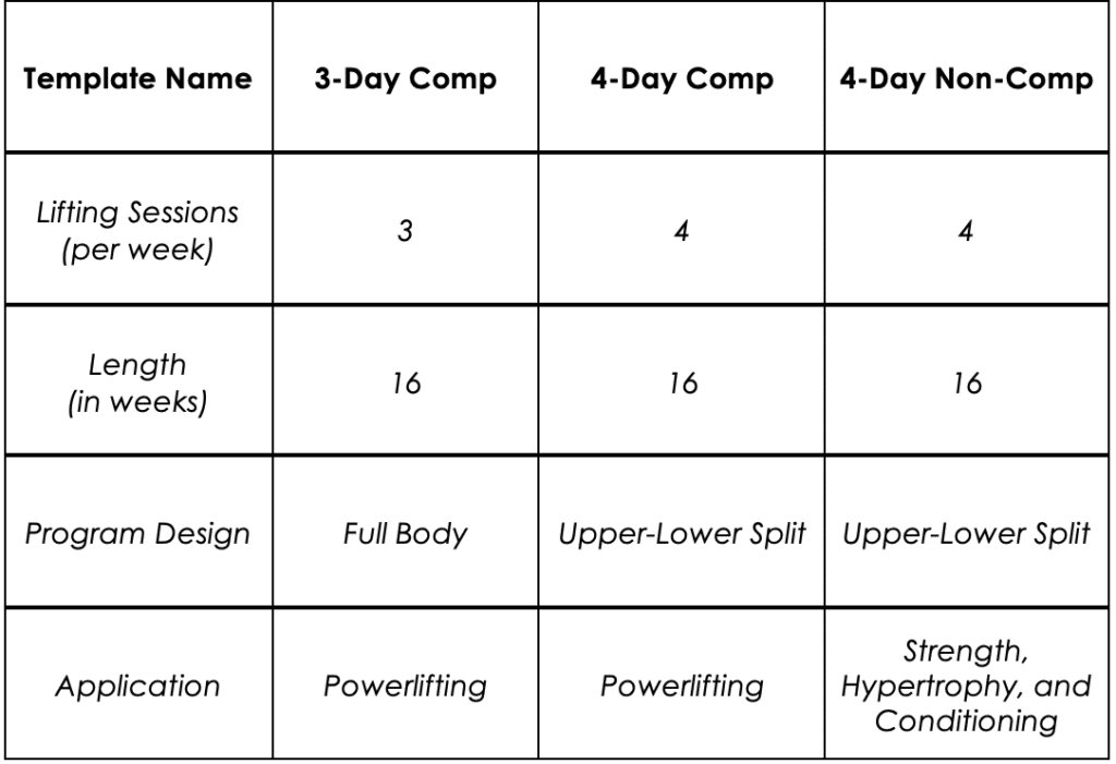 The “Comp” programs are structured for those who want to test their 1-Rep Maxes (1RMs) or prepare for a powerlifting meet, featuring a dedicated peaking block.